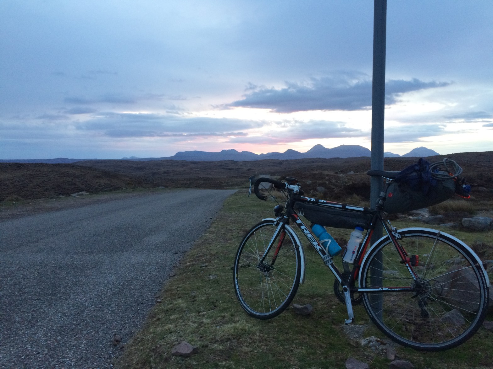 Getting to around 4am, I turned off a major road, over a cattle grid and started to climb. This was the start of the Belach na baa pass. I had read about it and heard of people riding over it, but never been in this part of the world to attempt it myself. No better time than 4am on a Sunday morning. Climbing hills at night is strange. In some ways I think it makes the climb easier, it takes the knowledge of what is ahead away, therefore you focus on the present, and don’t worry about how hard it looks further up the hill. The climb was tough, but I took it easy, seeing no cars or people, only a few sheep, I stopped on the hairpins to try and get a photo, but the night was too dark. Cresting the top, the sky started to get brighter, and the first signs of daylight were emerging. Looking over to Skye in this light was a privilege. I felt miles from anywhere, riding through the night was worth this one moment. I stopped at the top, took stock of where I was and just relaxed for a few minutes.