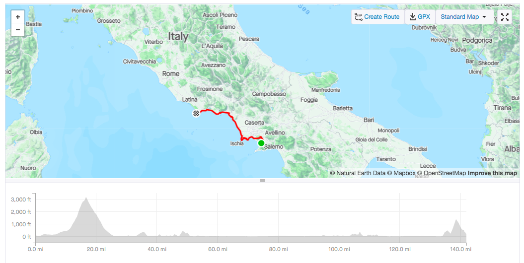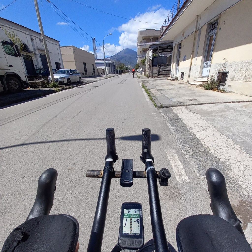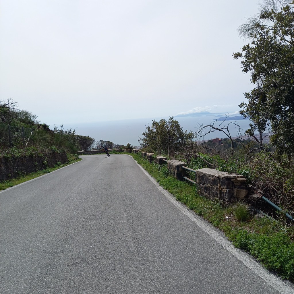 Cycling led to walking, which led to sliding on volcanic rocks. Somehow I made it to the top and what greeted me was a panoramic view down to Naples, the gulf of Naples and a long tarmac descent. I didn’t complain as freewheeling was well needed by this point.