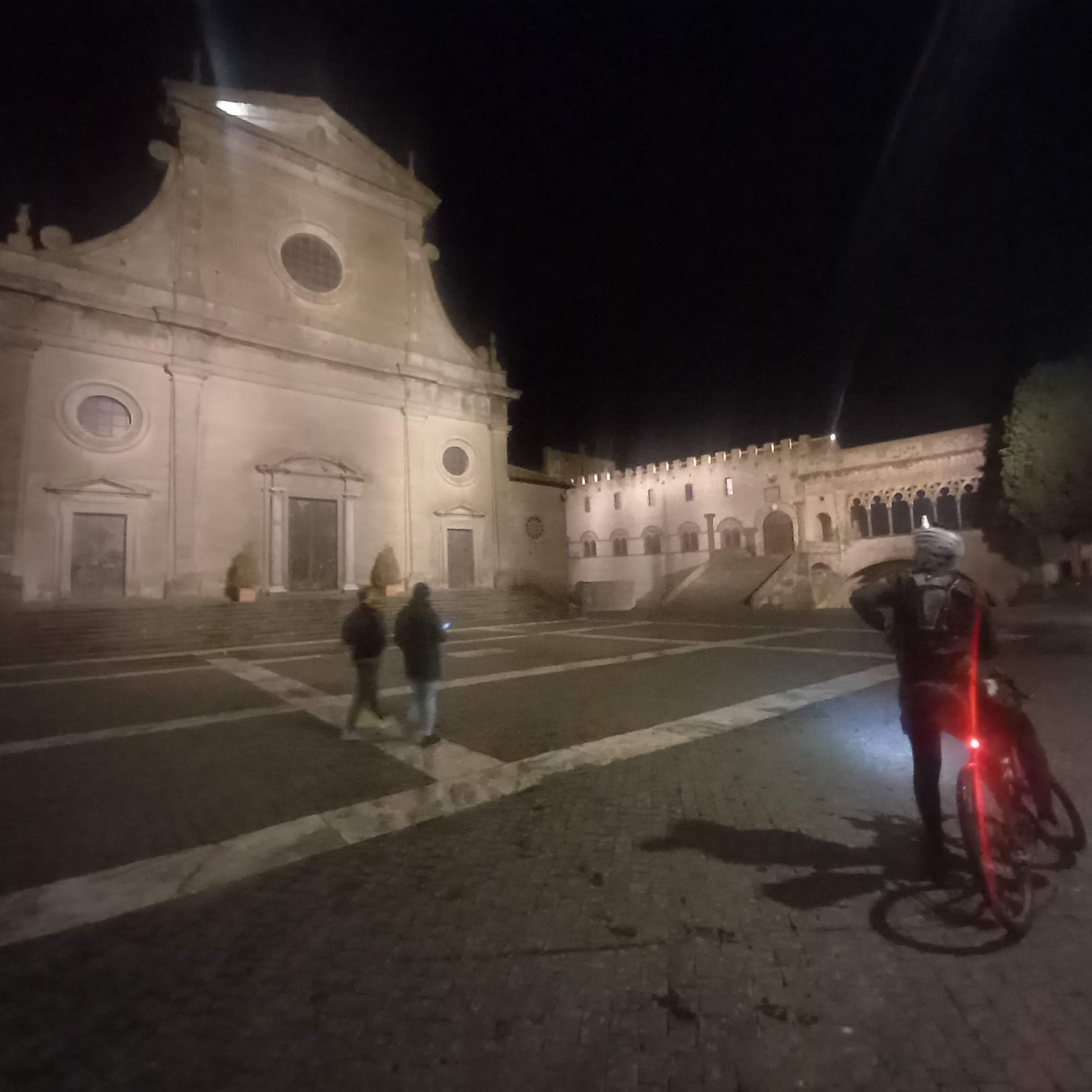 I stop in the next village, Capranica and look for somewhere inside to sleep. I knock on doors, no luck. I ring a number on a bnb door, but no luck. It is a national holiday in Italy and there is no room anywhere. When I set off again, I see a light behind me and it is another rider. Tom from Bristol. I am pleased to see someone, and I think he is too, as we relay similair stories from the same sheepdogs. We agree to ride together to the next city, where we will try and find somewhere to stay.