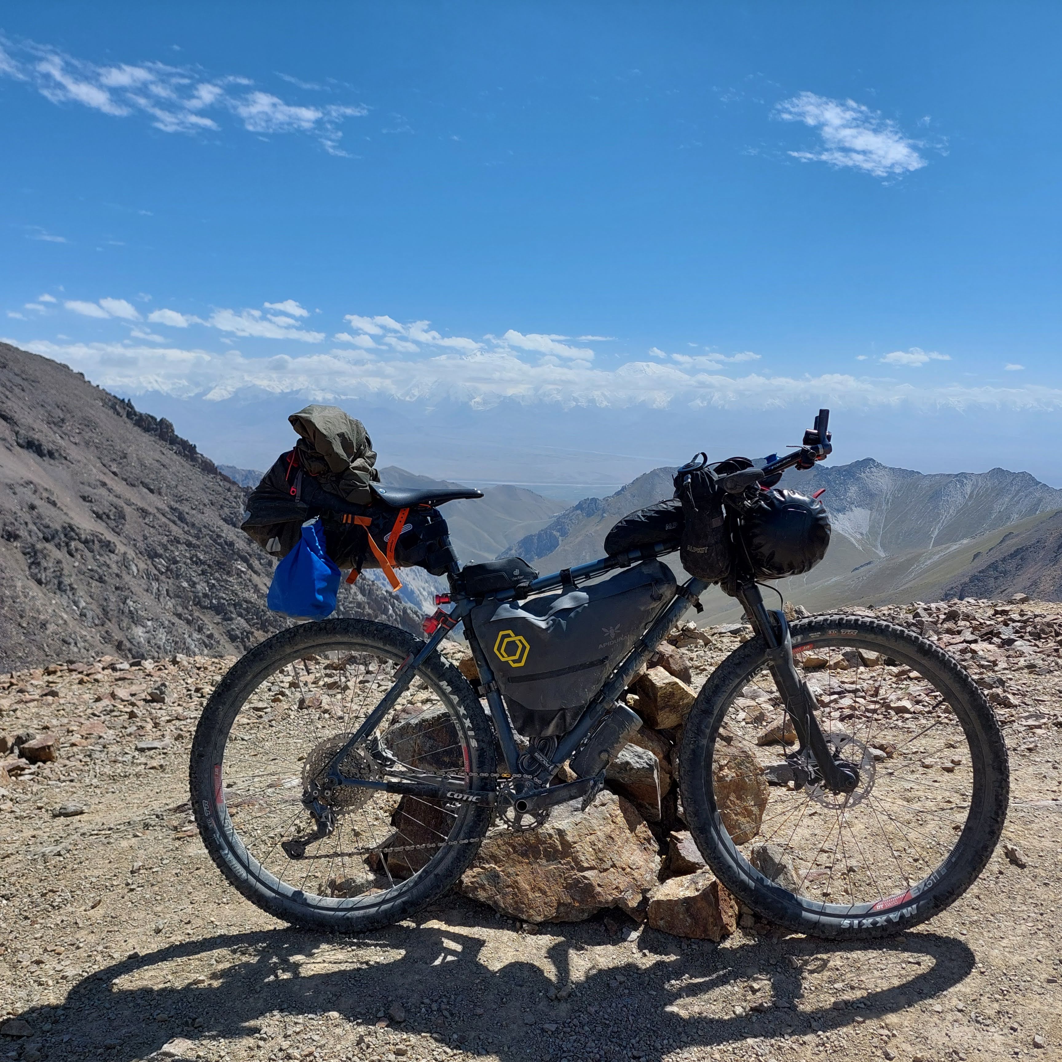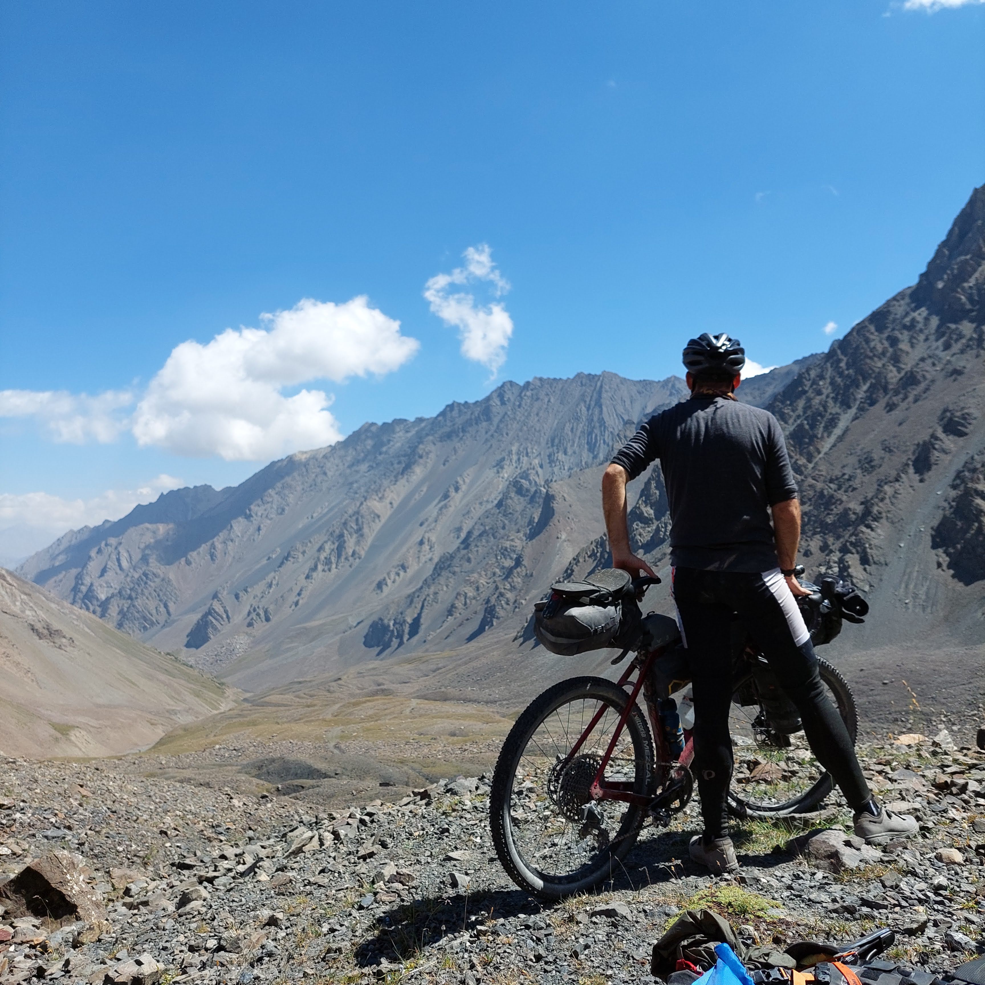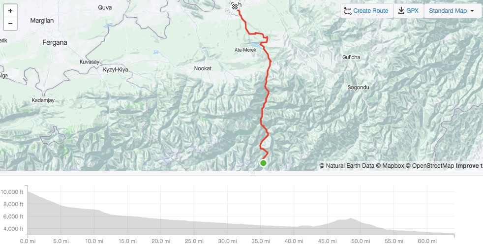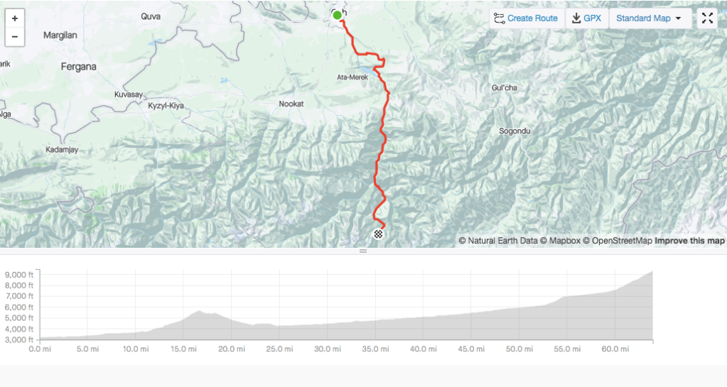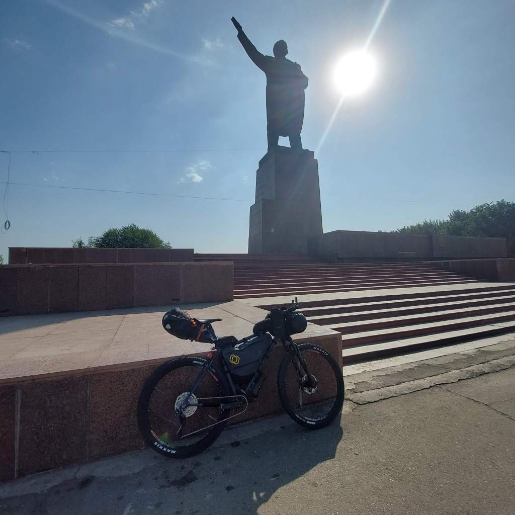 To acclimatise to the altitude before the race, I planned a 3 day ride, 2 day camp on the 1st pass of the race. I organised with another racer to meet up at the Lenin Statue at 9am. After a bit of faffing my end, I got there just after 9 and met up with David, from Kansas. We stocked up on water and headed south out of Osh. The heat was pressing down on us, nearing 30 degrees celsius even at this early point in the day.