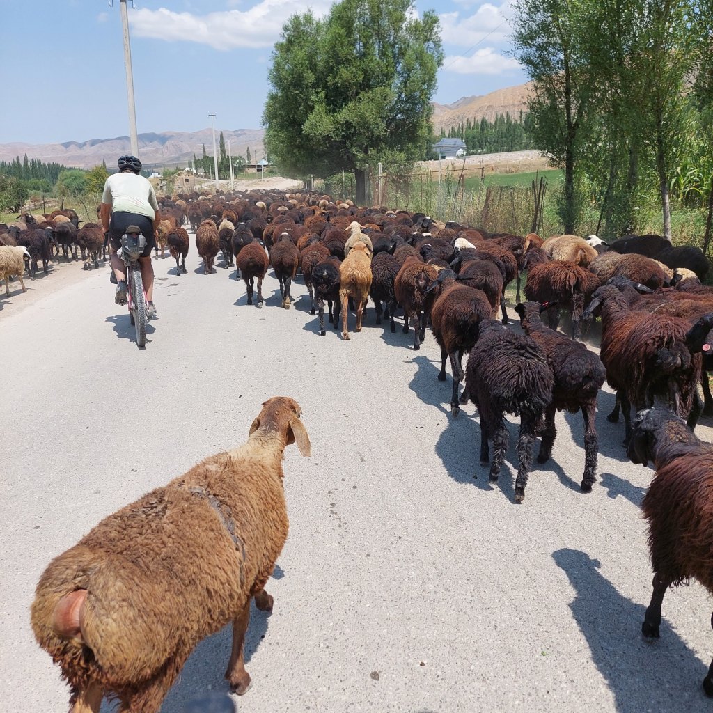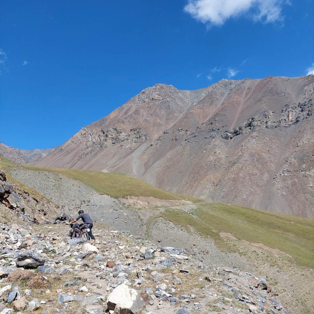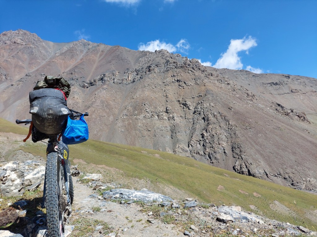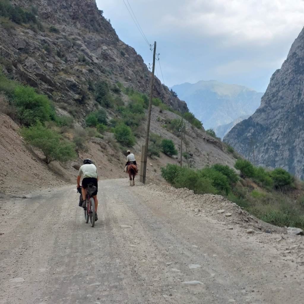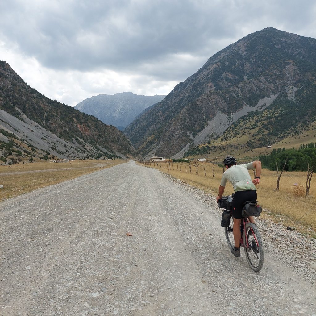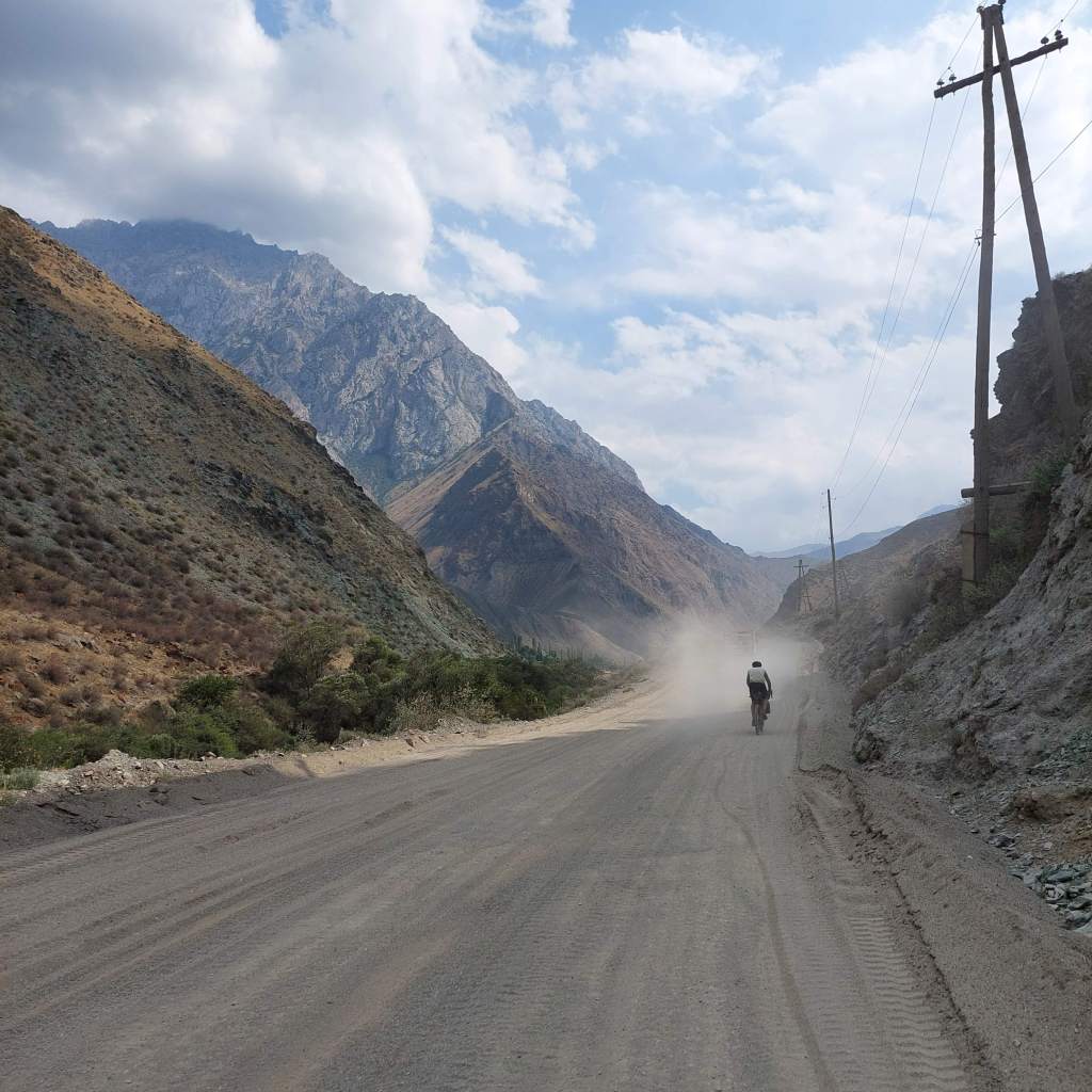 We skirted the traffic of Osh and were eventually on quiet gravel roads. After 8 mile or so the route started to head upwards and the first climb was a few miles long with a bit of pushing through a dried up riverbed. At the top, the descent was a nice reward and we came across a small village. Most of the children had been welcoming, however one group of kids gave us the middle finger as we rode past, I saw the funny side. We then stopped in a shop to top up on water and get some ice cream. We talked a little with Google translate with the woman who owned the shop then she brought us some bread for us to take on our travels. This made up for the middle finger from the group of kids.