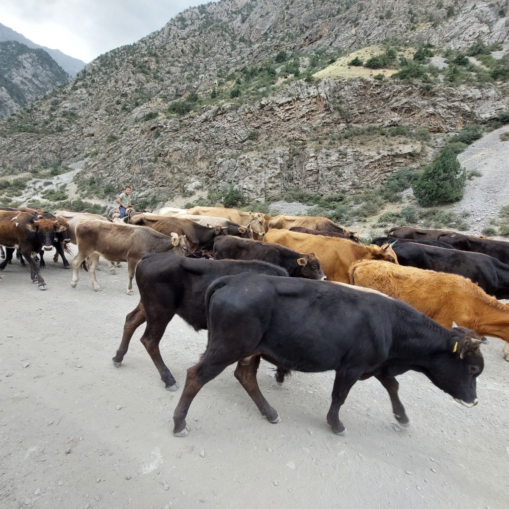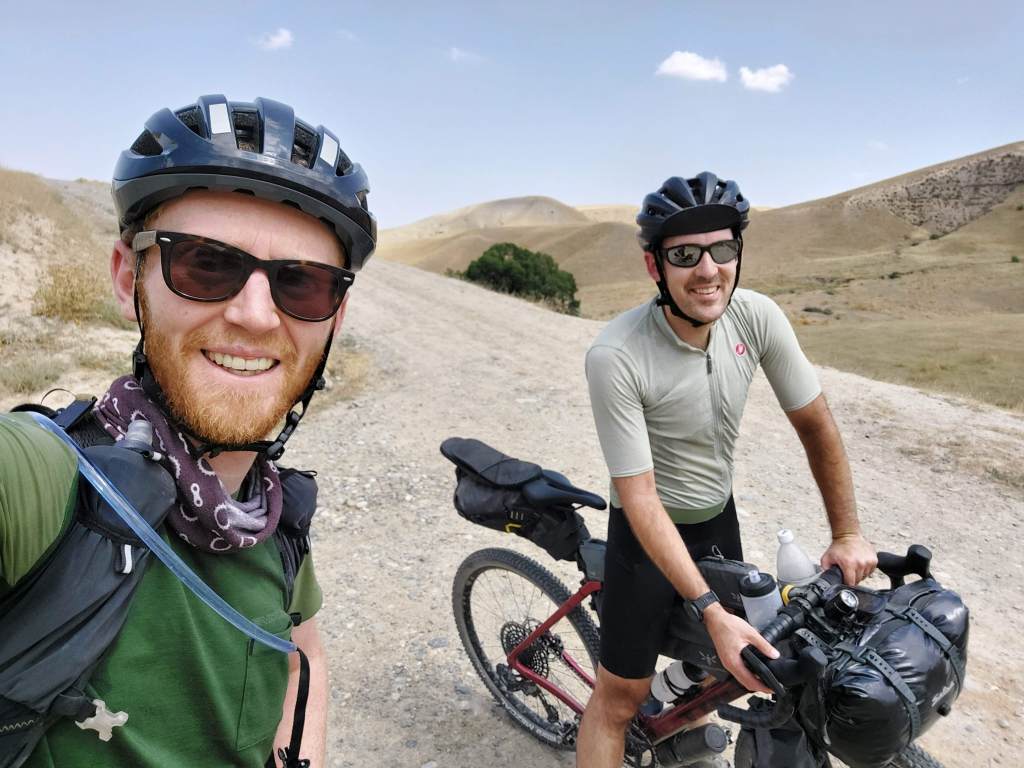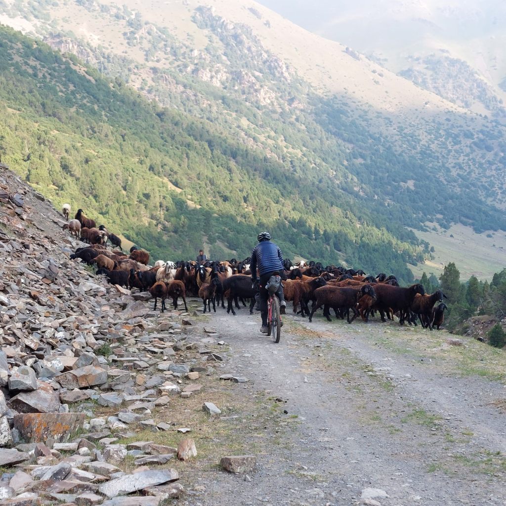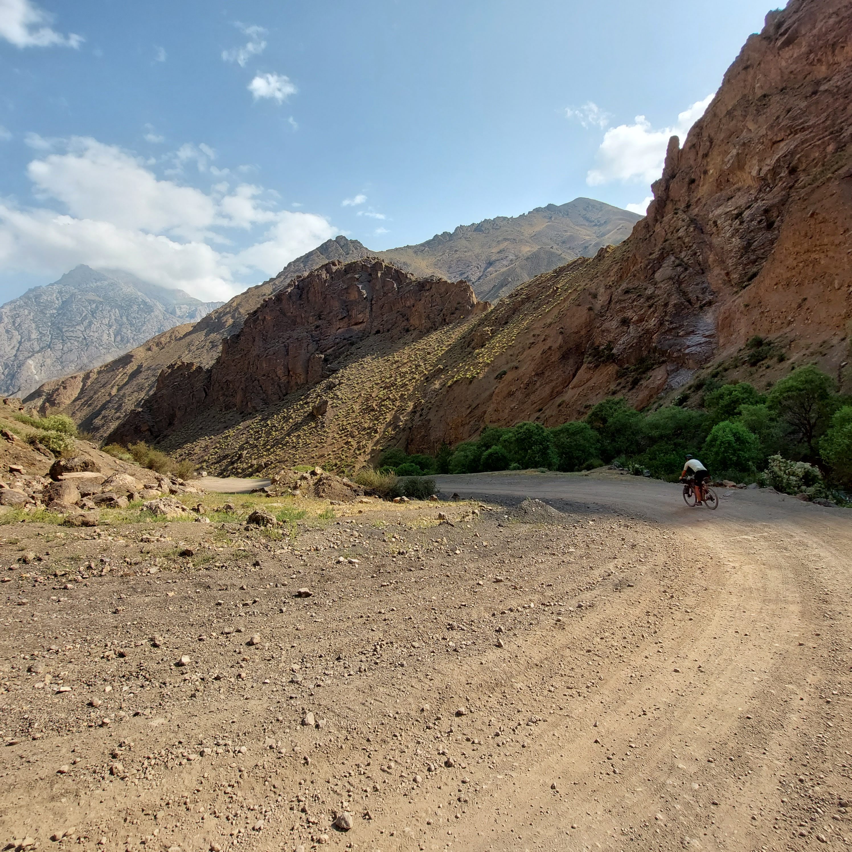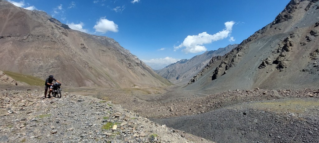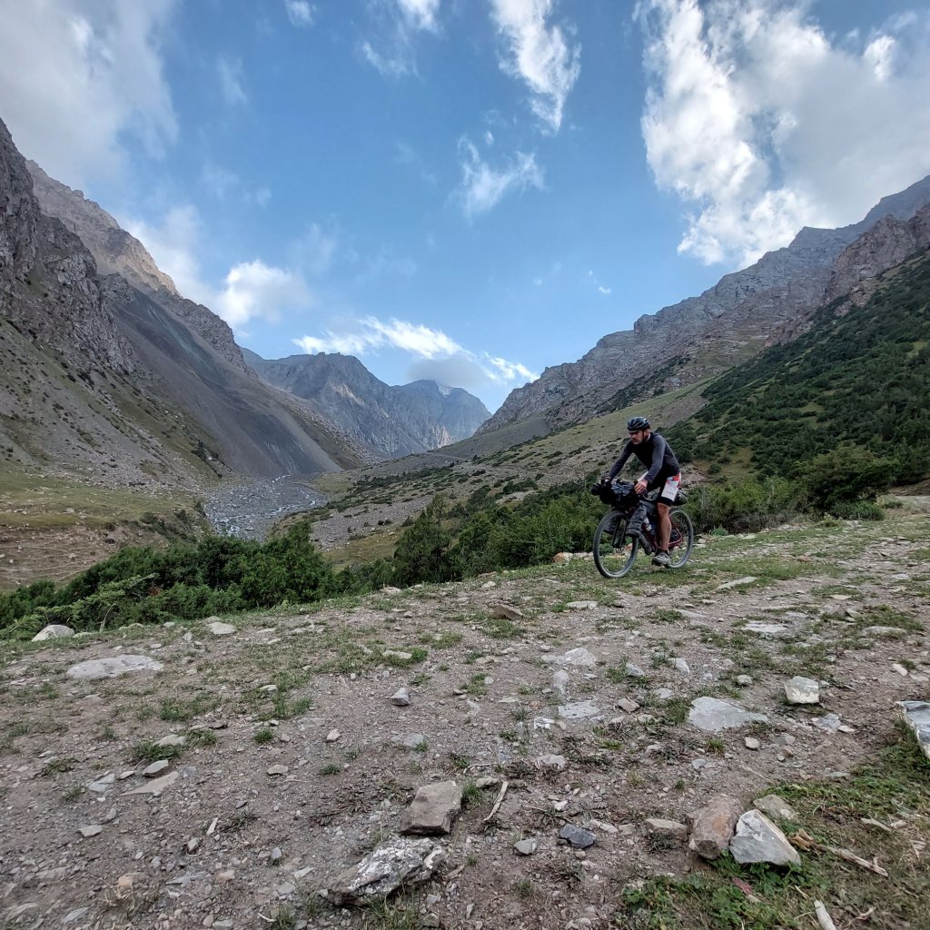 We skirted the traffic of Osh and were eventually on quiet gravel roads. After 8 mile or so the route started to head upwards and the first climb was a few miles long with a bit of pushing through a dried up riverbed. At the top, the descent was a nice reward and we came across a small village. Most of the children had been welcoming, however one group of kids gave us the middle finger as we rode past, I saw the funny side. We then stopped in a shop to top up on water and get some ice cream. We talked a little with Google translate with the woman who owned the shop then she brought us some bread for us to take on our travels. This made up for the middle finger from the group of kids.