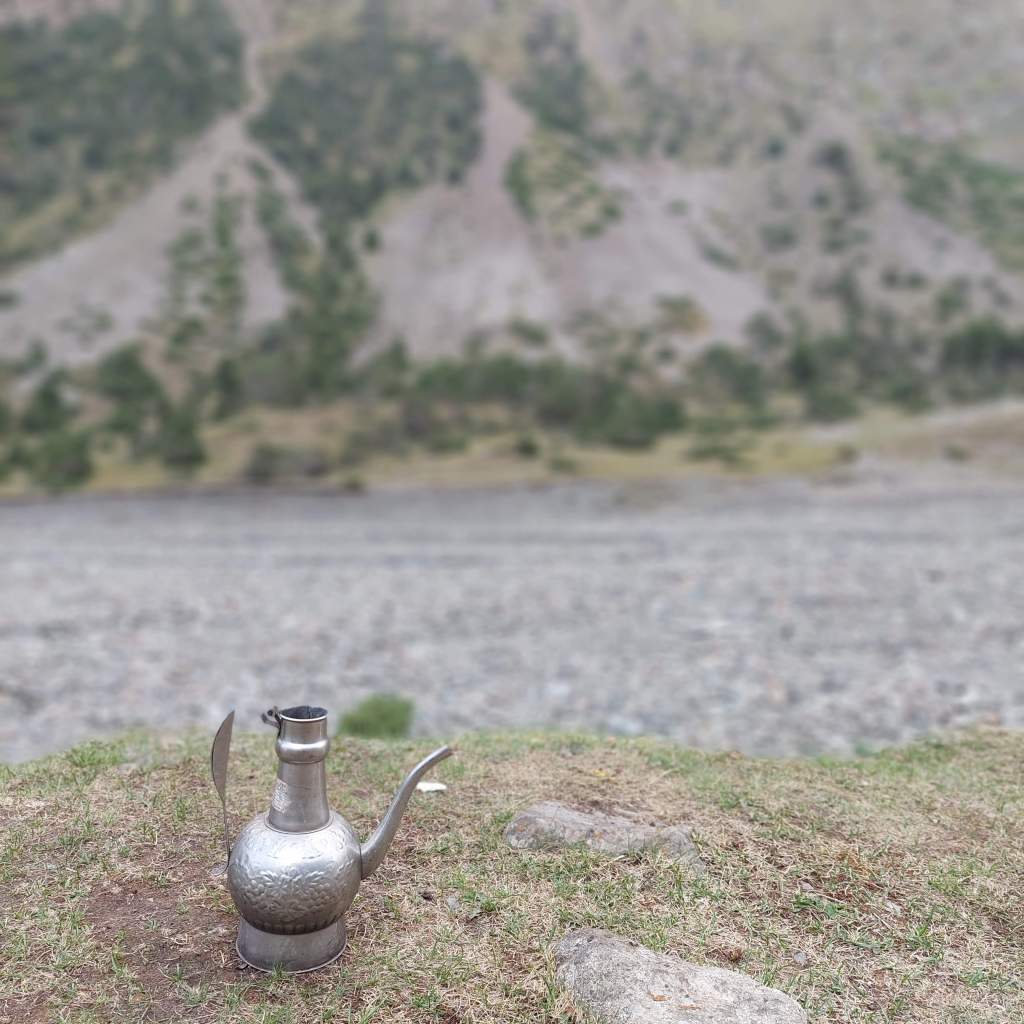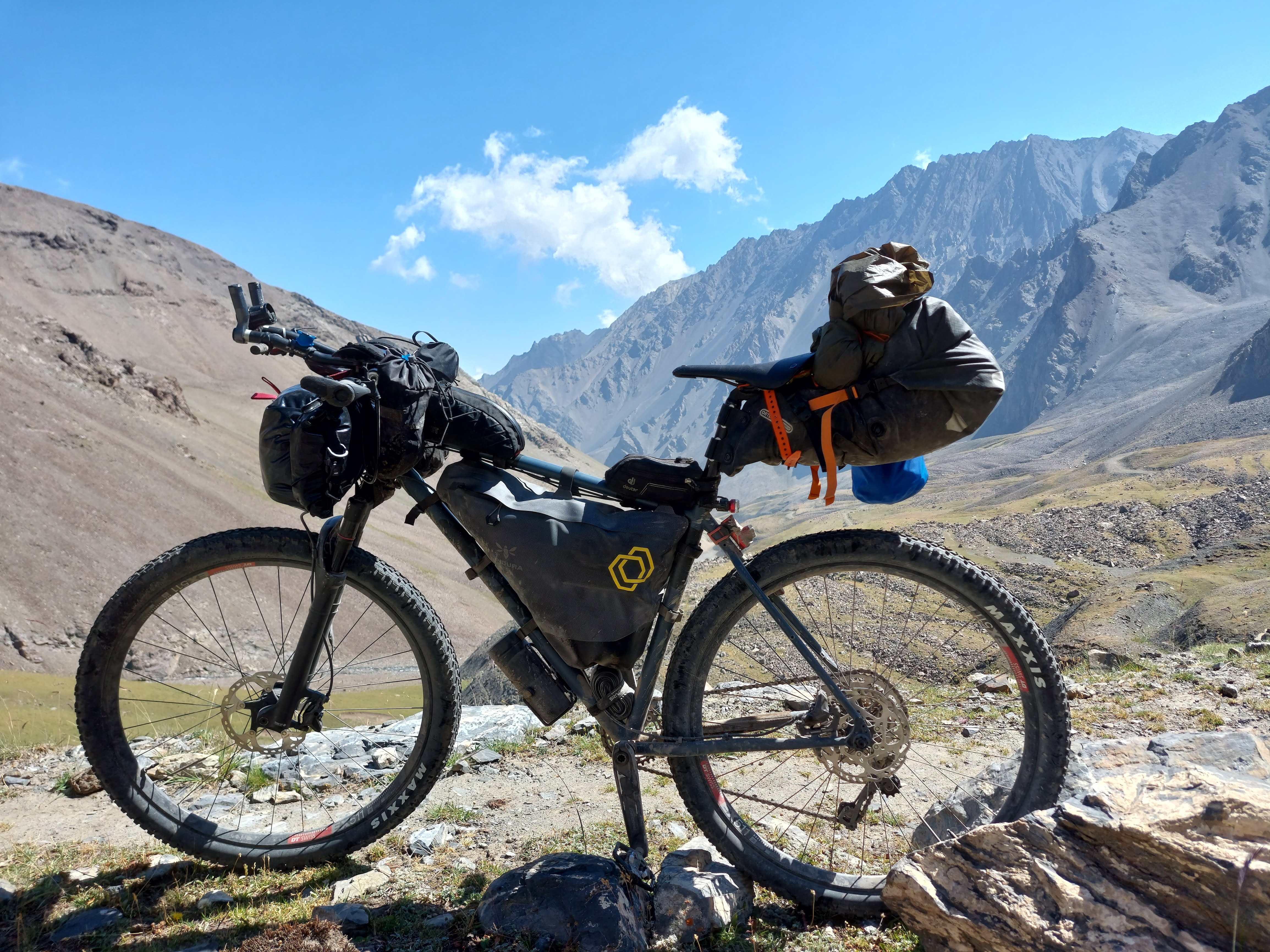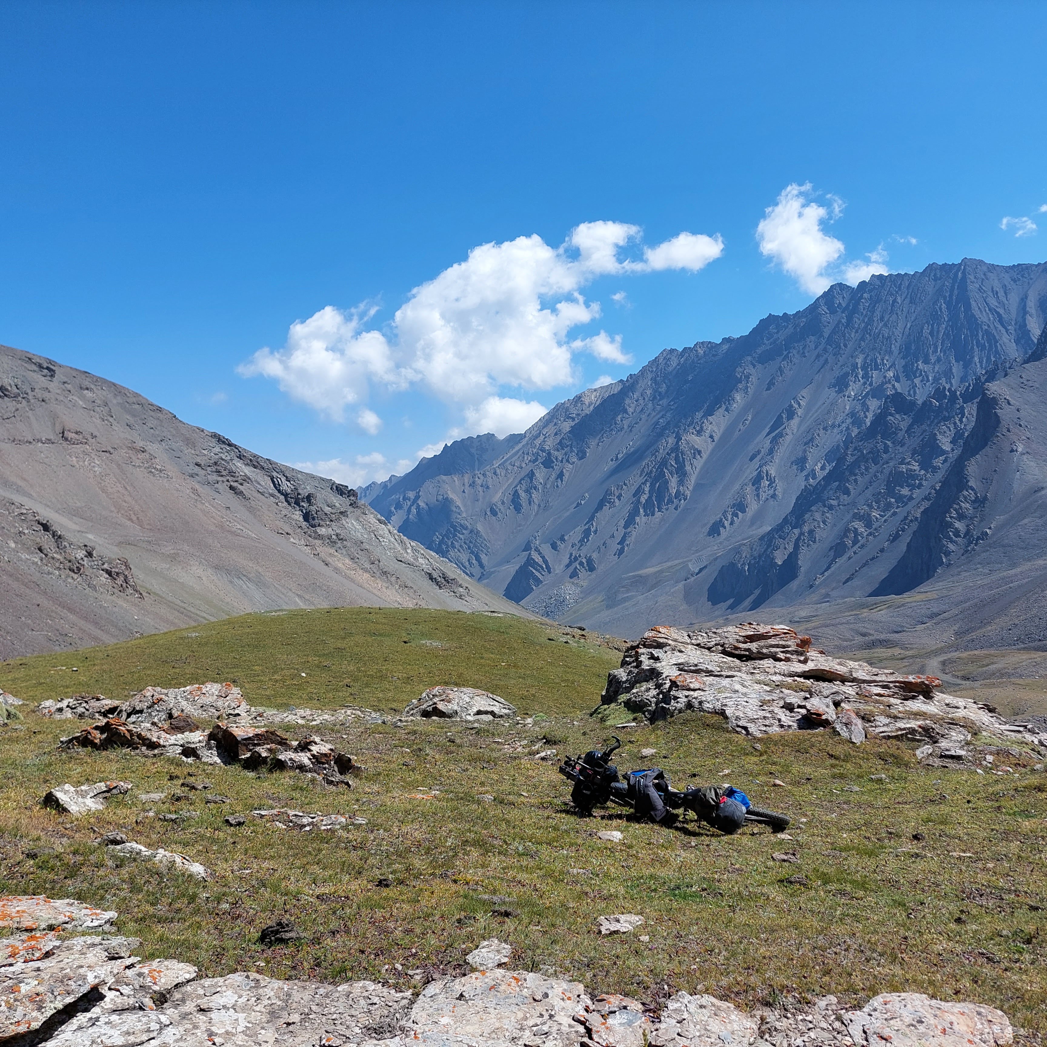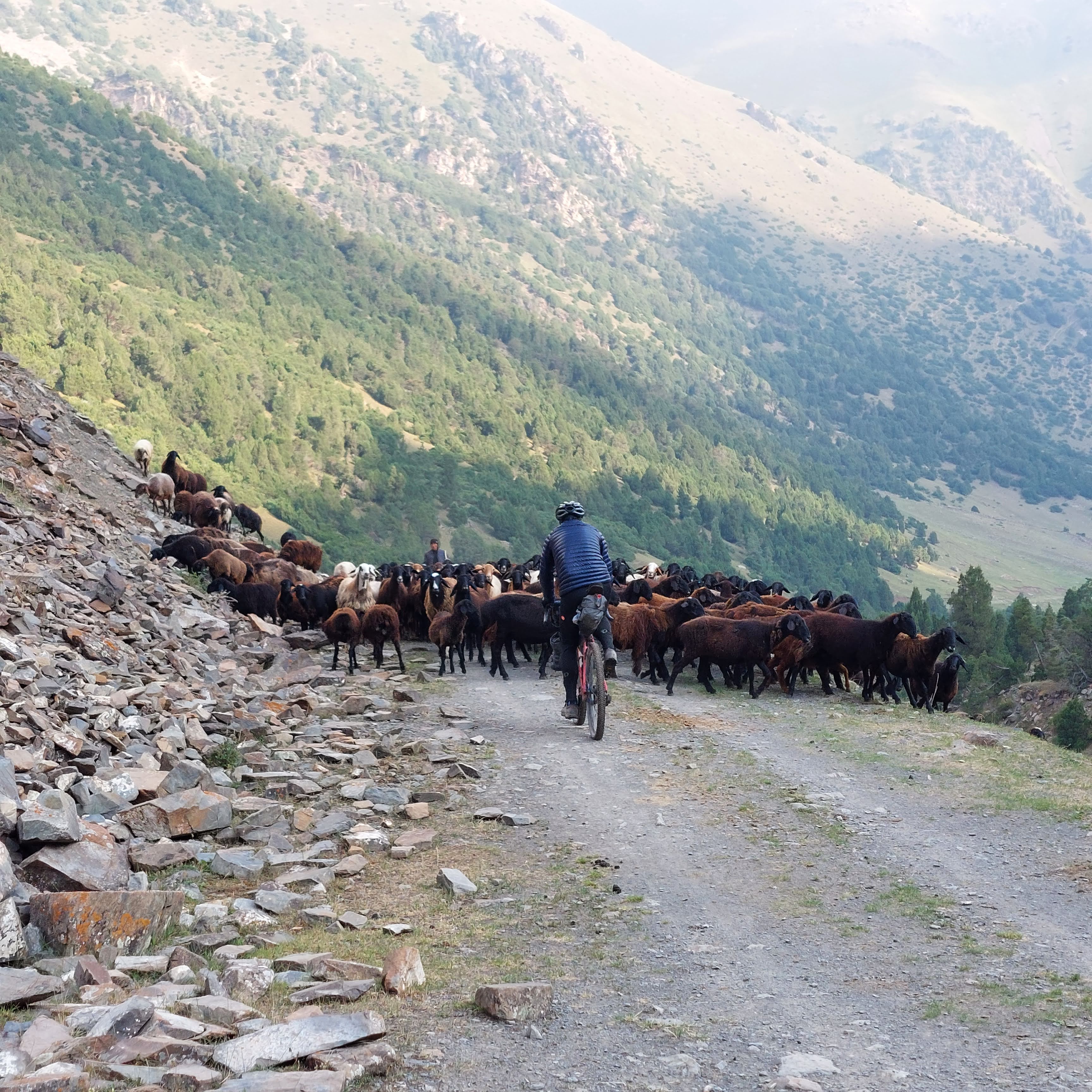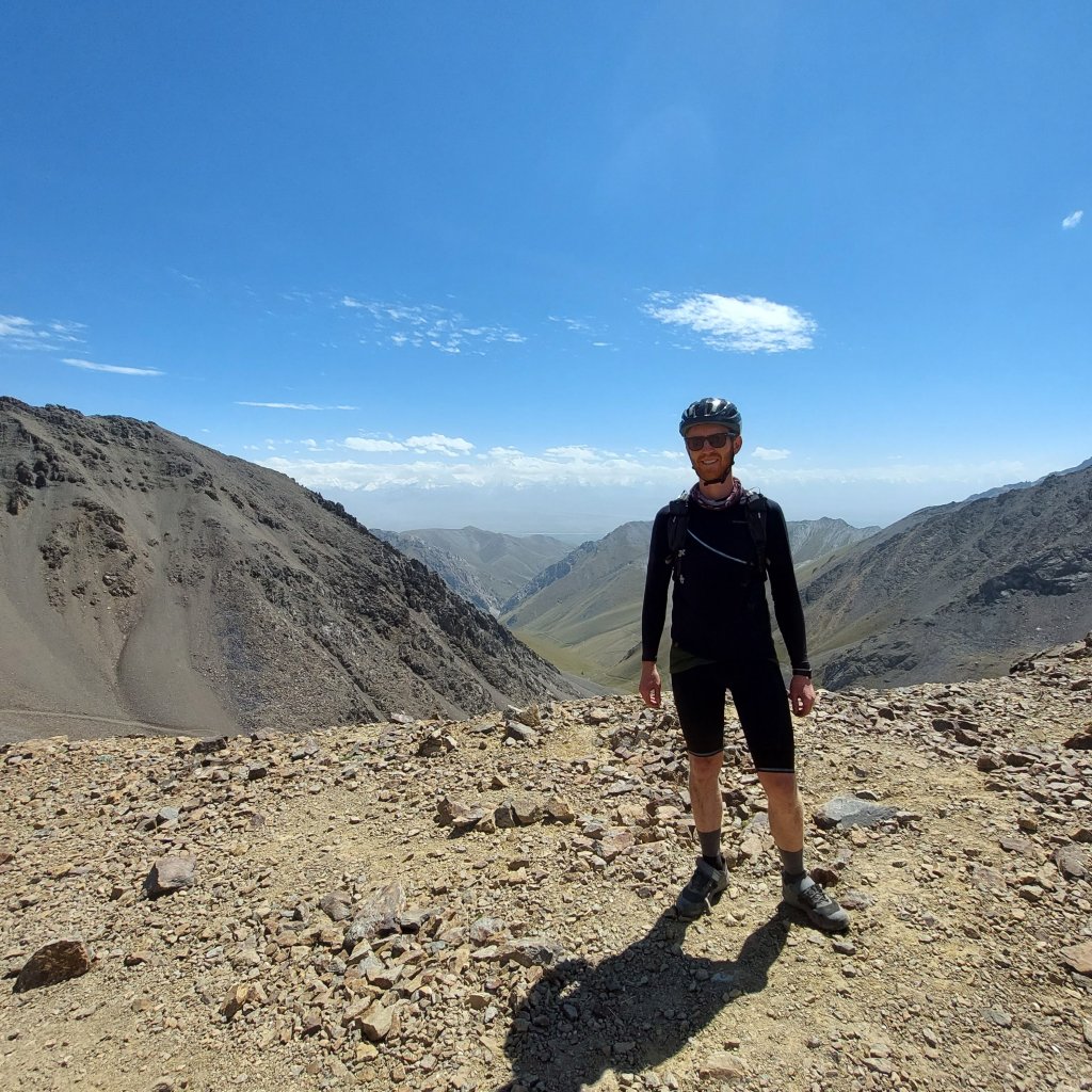 We skirted the traffic of Osh and were eventually on quiet gravel roads. After 8 mile or so the route started to head upwards and the first climb was a few miles long with a bit of pushing through a dried up riverbed. At the top, the descent was a nice reward and we came across a small village. Most of the children had been welcoming, however one group of kids gave us the middle finger as we rode past, I saw the funny side. We then stopped in a shop to top up on water and get some ice cream. We talked a little with Google translate with the woman who owned the shop then she brought us some bread for us to take on our travels. This made up for the middle finger from the group of kids.