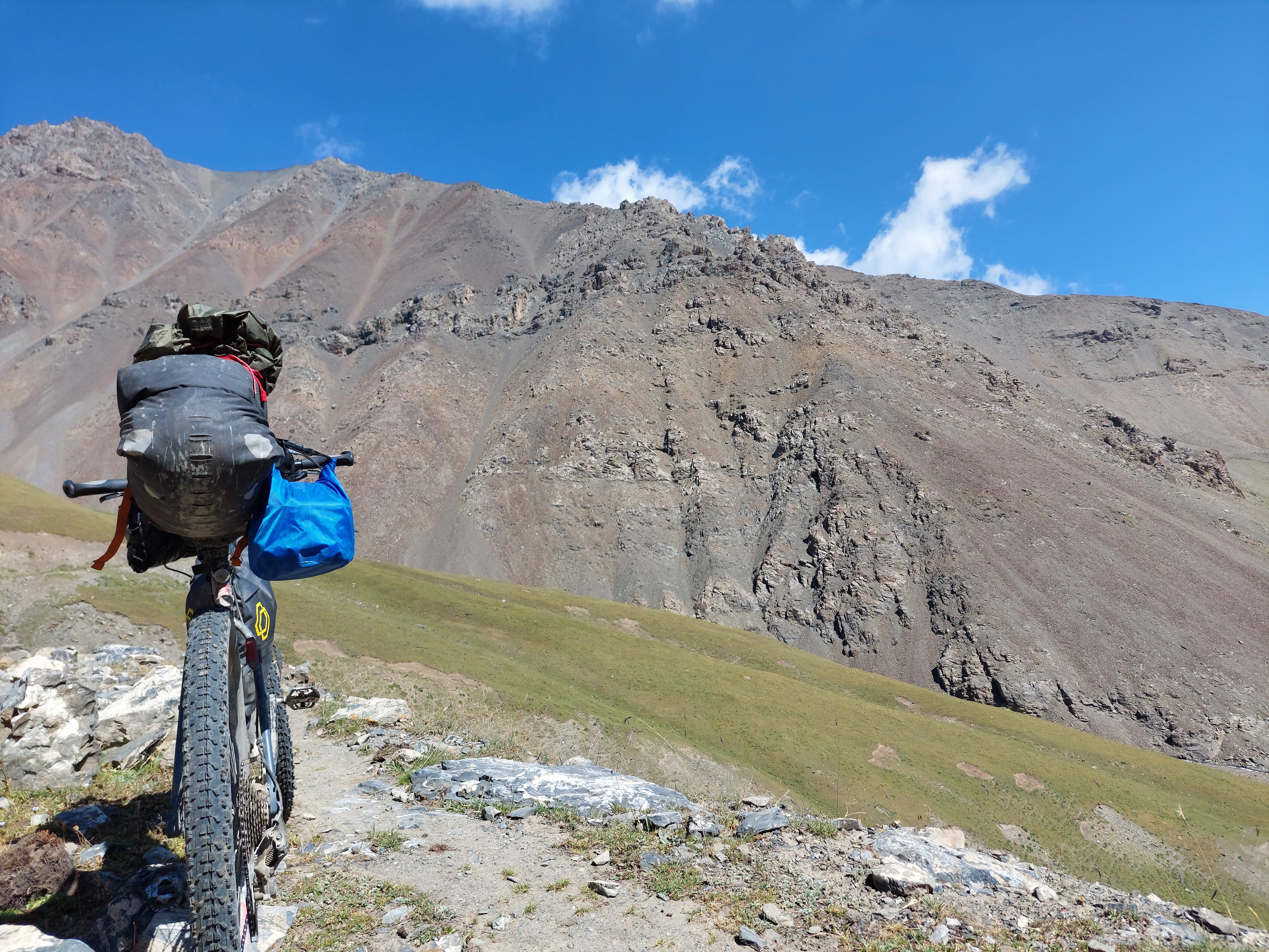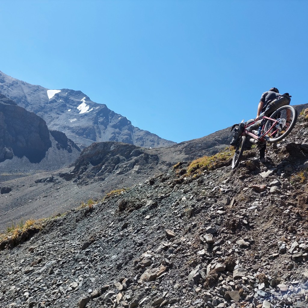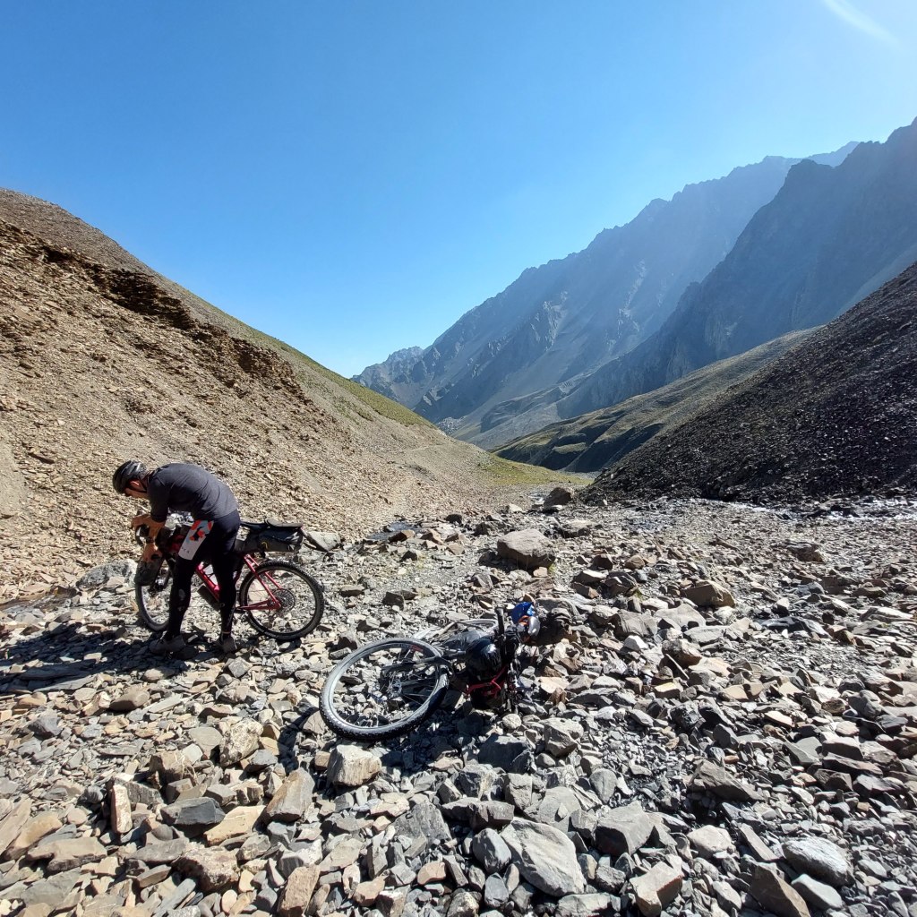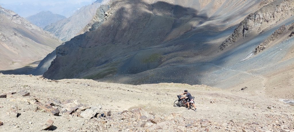 We eventually got through this after 20 minutes or so and were back to the part of the route where we could push our bikes. Albeit not that easily, with a gradient of over 30% in some parts, now over 3600m altitude. After slow progress and plenty of stops, we made it to the top.
