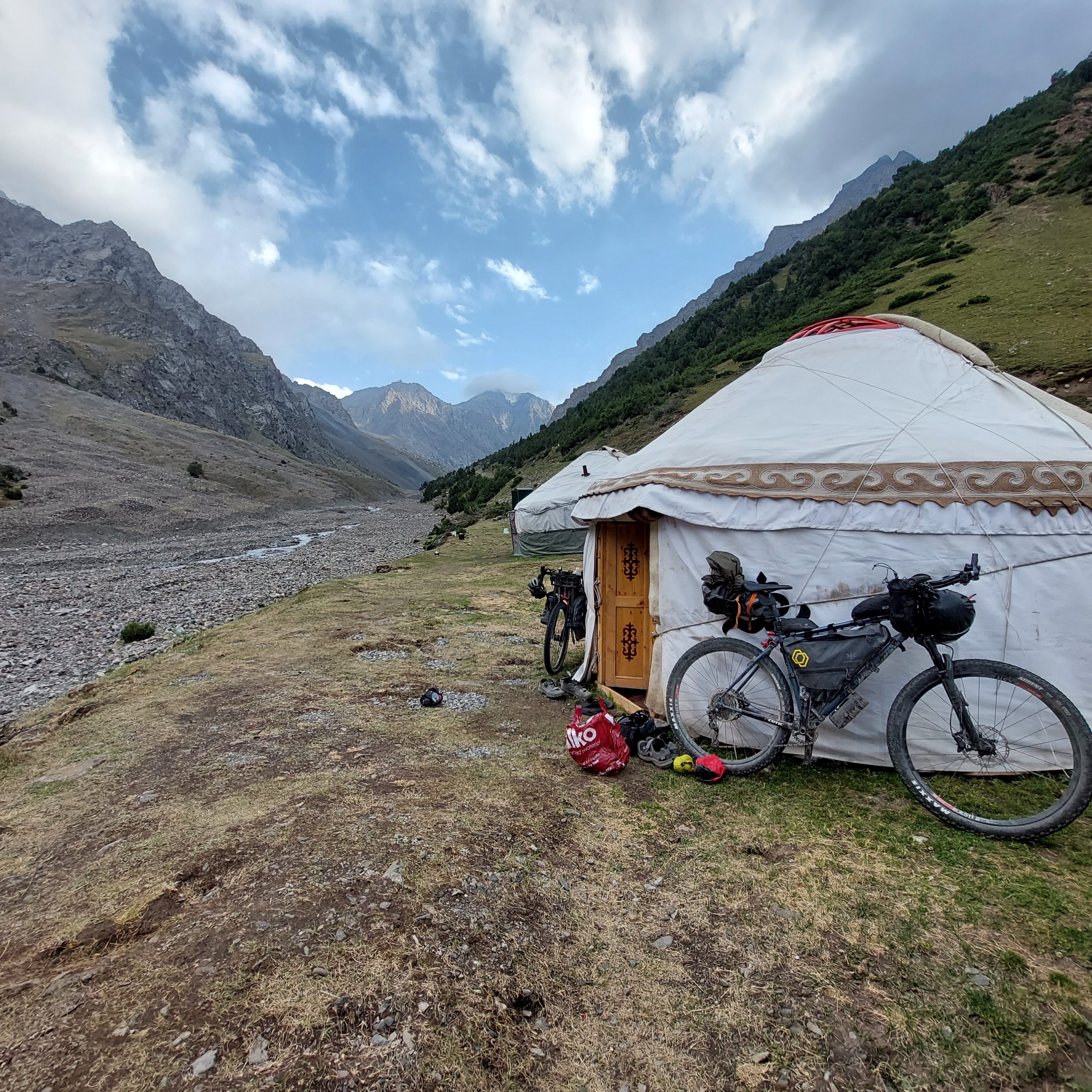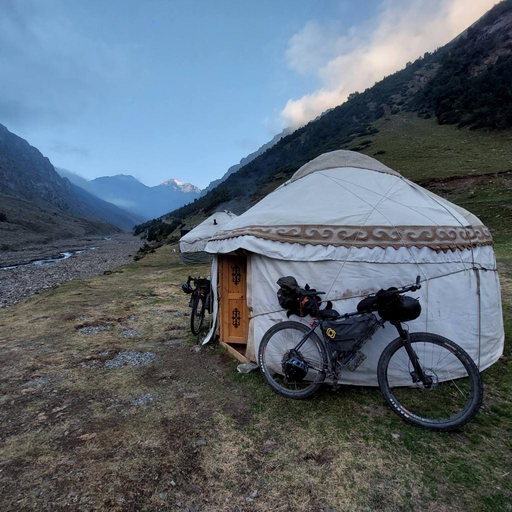 We woke at 6am, cooked breakfast, packed tents away and were riding around 7.30. After a mile or so we passed a yurt camp with a few other riders there, camped up. We carried on.