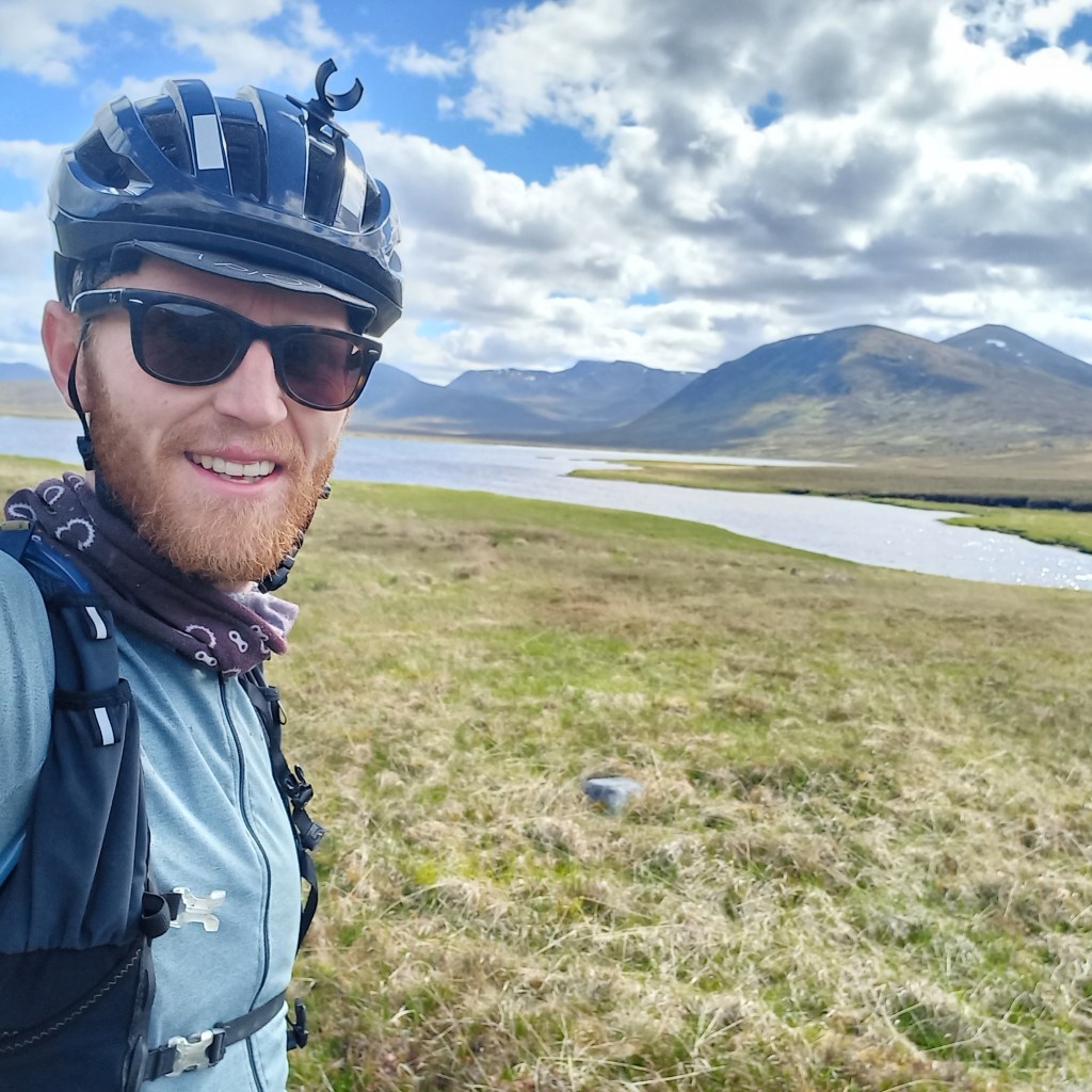After around 50 miles, I was making good time and as we got to Loch Ericht, Alan Goldsmith the organiser of the race, caught and passed me and said something along the lines of ‘this is the real start line’. He was right, the first boggy walk started, then the route took a turn to the left, away from the Loch and up in the shadow of Ben Alder and the 727 meter pass. This included, mostly walking with the bike and stopping for water. I still felt strong, even with a good few miles in the legs on a heavy bike!