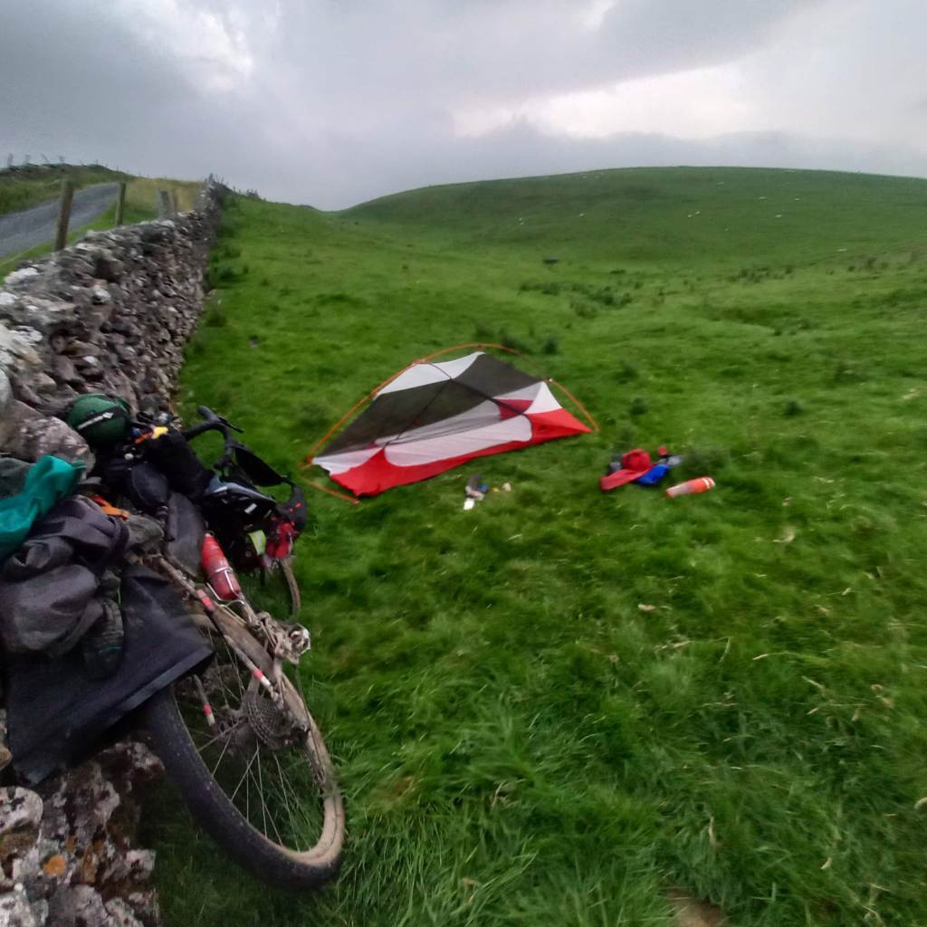 I made a pact with myself I would keep going until Horton in Ribblesdale and then find a place to camp after that. The riding wasnt too bad, some rocky uphills and decents and then I found myself looking for a campspot just after 11pm. It was very dark and with not much monlight, really hard to find a good place to pitch up. I tried a few potential places but wasnt happy. I then hopped over a fence and although on a slight hill, this spot would have to do. The rain and wind started as i put my tent up. Then a pole connector snapped on my tent, and gorilla tape and super glue to the rescue, I was finally in my sleeping bag just after midnight. CP2 loomed tomorrow.